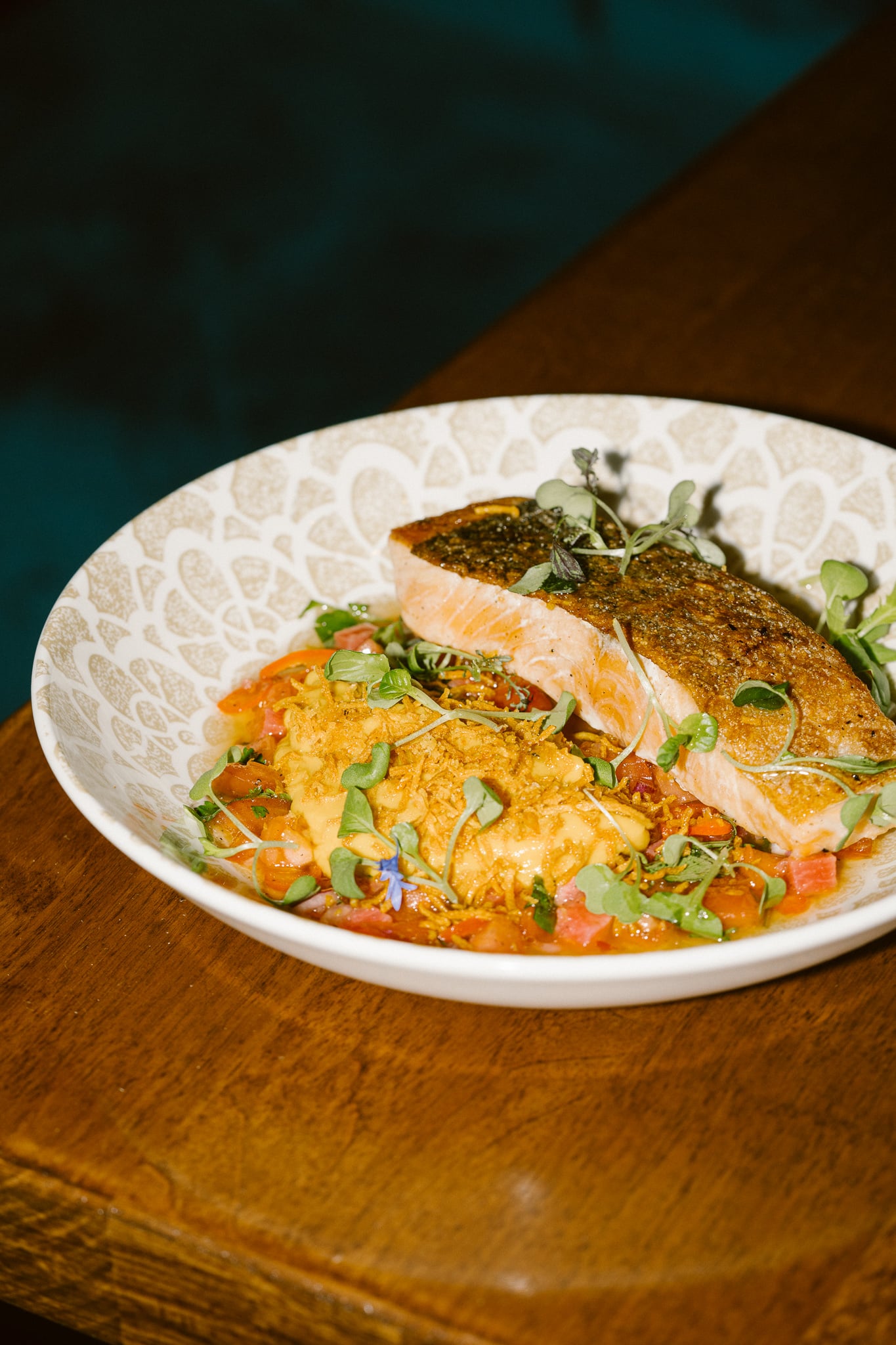 Sashimi de saumon, ponzu à l’aji amarillo, pommes de terre croustillantes