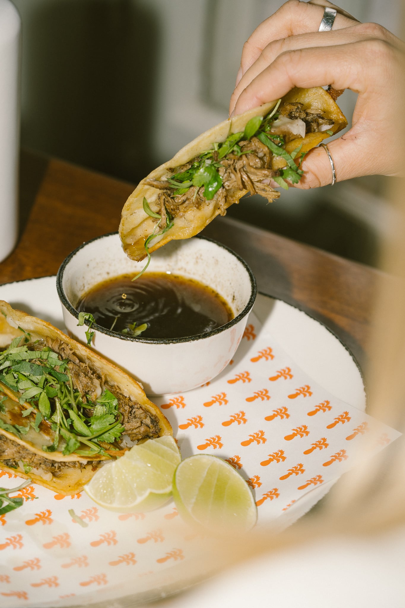 Boeuf braisé, monterey jack, oignon, coriandre, servi avec notre consommé