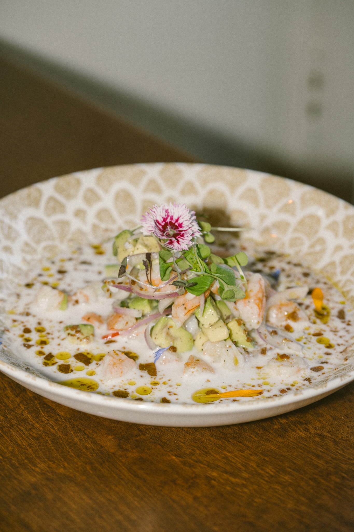 Crevettes, lait de coco, avocat, jus de lime, oignon rouge