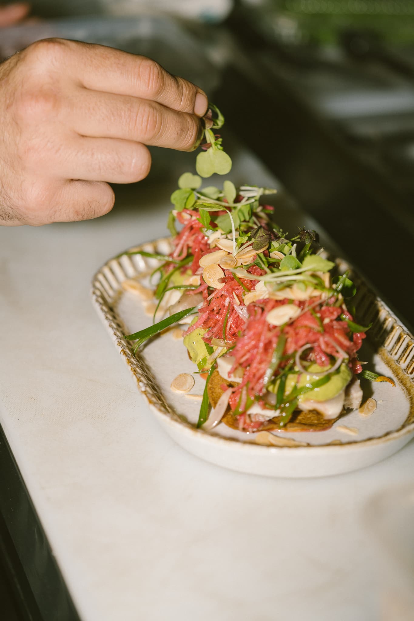 Tataki d’albacore, aji verde, salade de radis melon, tostada de maïs bleu, amande